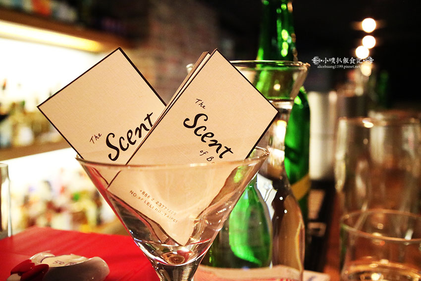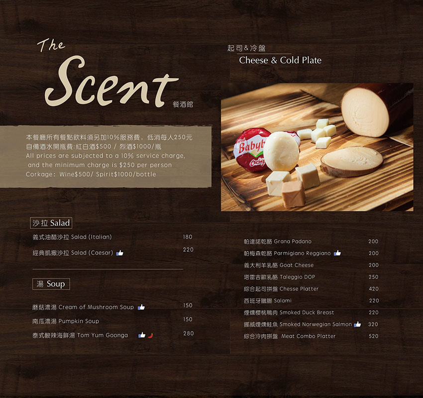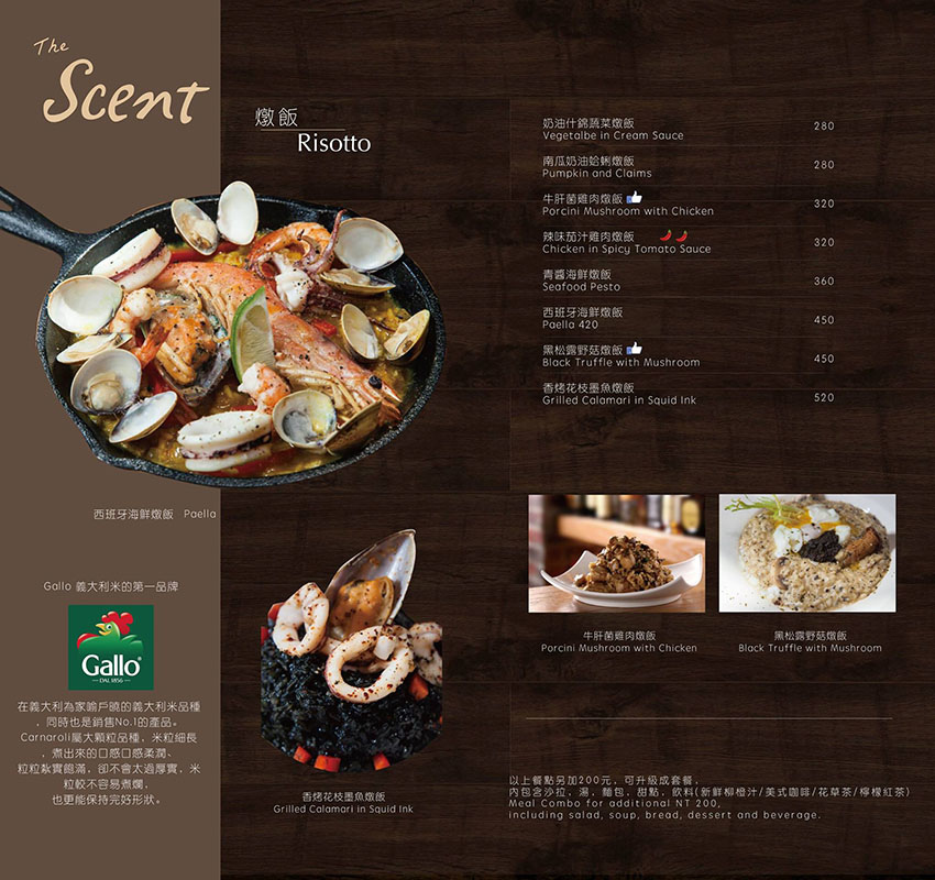 "The Scent",菜單樣式以各種無國界料理為主,從下酒小菜到大份量餐點,精緻西式排餐.炸物.燉飯.義大利麵...等,跨國界的料理,可以品嚐到多樣及極致的精緻享受