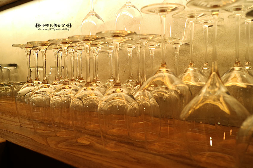 酒櫃滿滿的酒杯及各式酒類,讓人有一種"微醺"的氣氛,剛好這是吧檯的視角,如果下了班,想來這感受品酒的寧靜,倒是可以一個人沉靜一會兒!!!