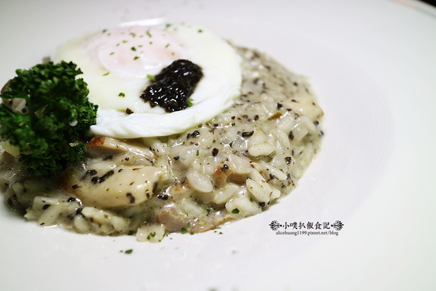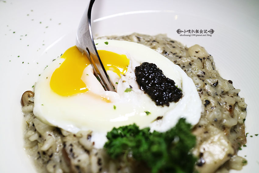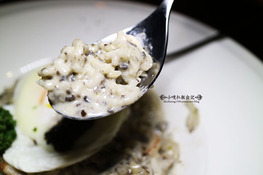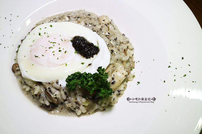 燉飯上覆蓋一片"水波蛋",輕輕劃開,蛋液流淌而下,澆淋在米粒上,融合松露獨特口感,口感香濃.滑順,滿滿的精緻口感,每一口盡是高級享受!!!