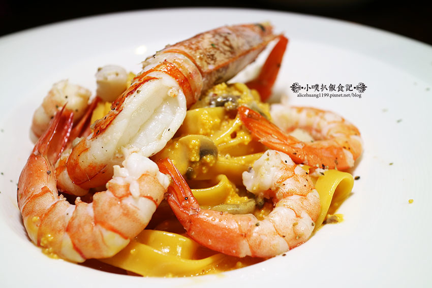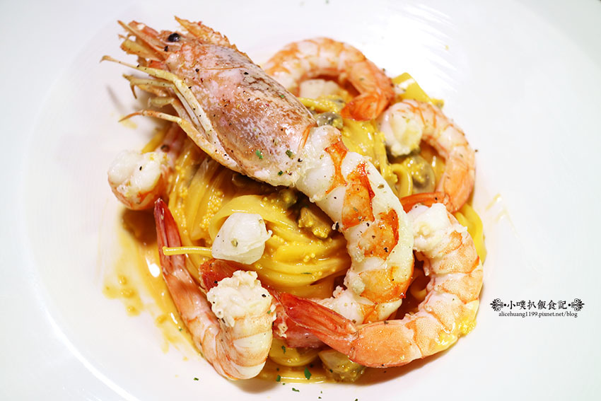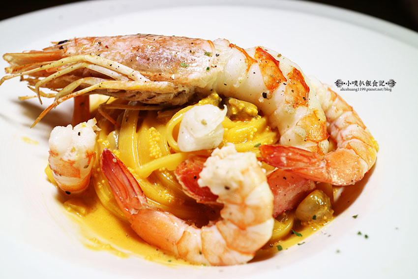 義大利麵融入台式飛魚卵.日式海膽,搭配數隻白蝦和一隻天使紅蝦,豐富配料,增添美味口感!!!
