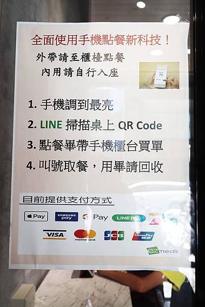 店內可使用手機點餐,使用LINE的掃瞄器掃 QR CODE,點餐後,先至櫃檯結帳,回座位等候叫號取餐