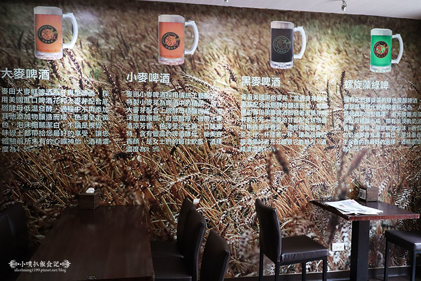 店內主推大麥啤酒、小麥啤酒、黑麥啤酒、螺旋藻綠啤