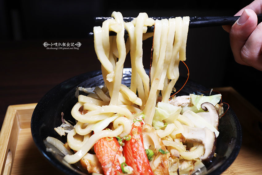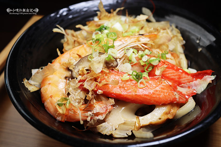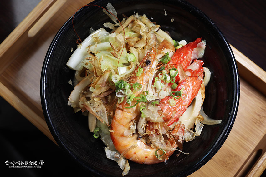 選用日本南僑烏龍麵,內容有 白蝦、帝王蟹蟳肉棒、竹輪、蔬菜、香菇,撒上洋蔥、柴魚片、蔥花