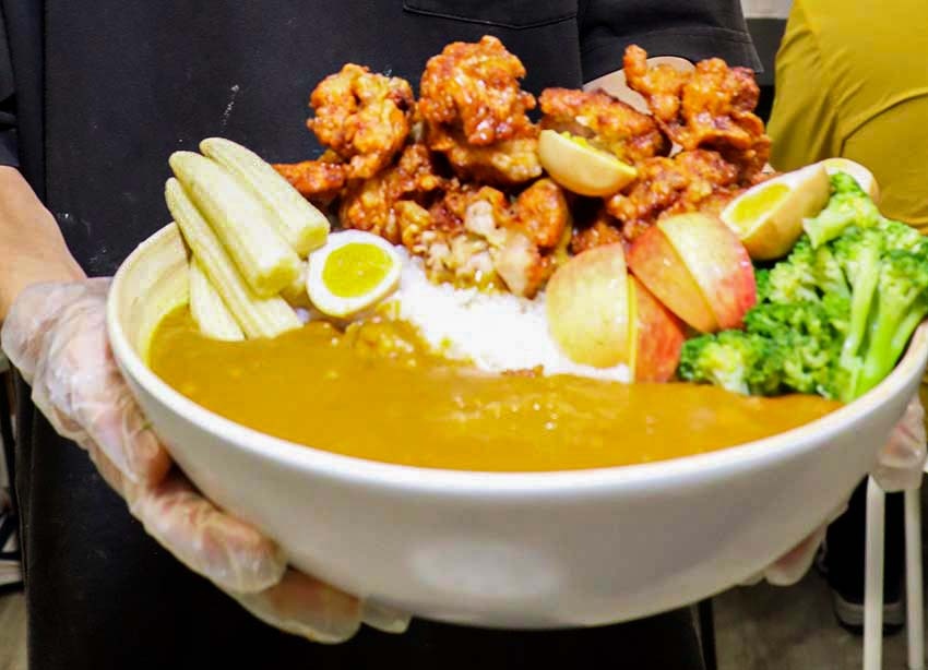 剛好當天也有人挑戰大胃王,一大碗的咖哩飯,總重4kg,實在是沉甸甸的一大份啊,簡直讓人驚訝到掉下巴啊